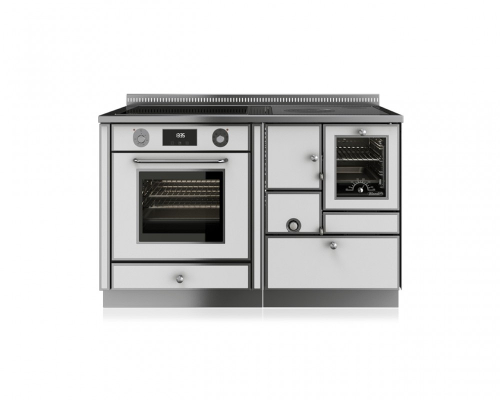 Kombiniran štedilnik na drva RE 60 z dodano strukturo 70 cm z vgrajeno električno pečico in kuhalno ploščo na plin, elektriko ali indukcijo.
