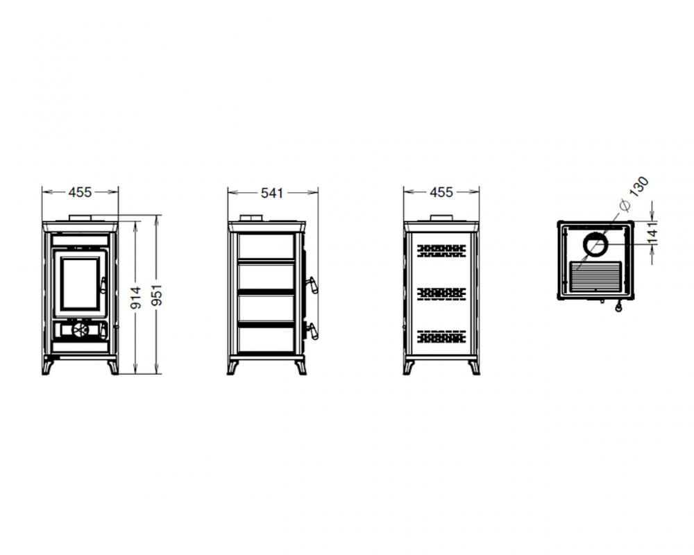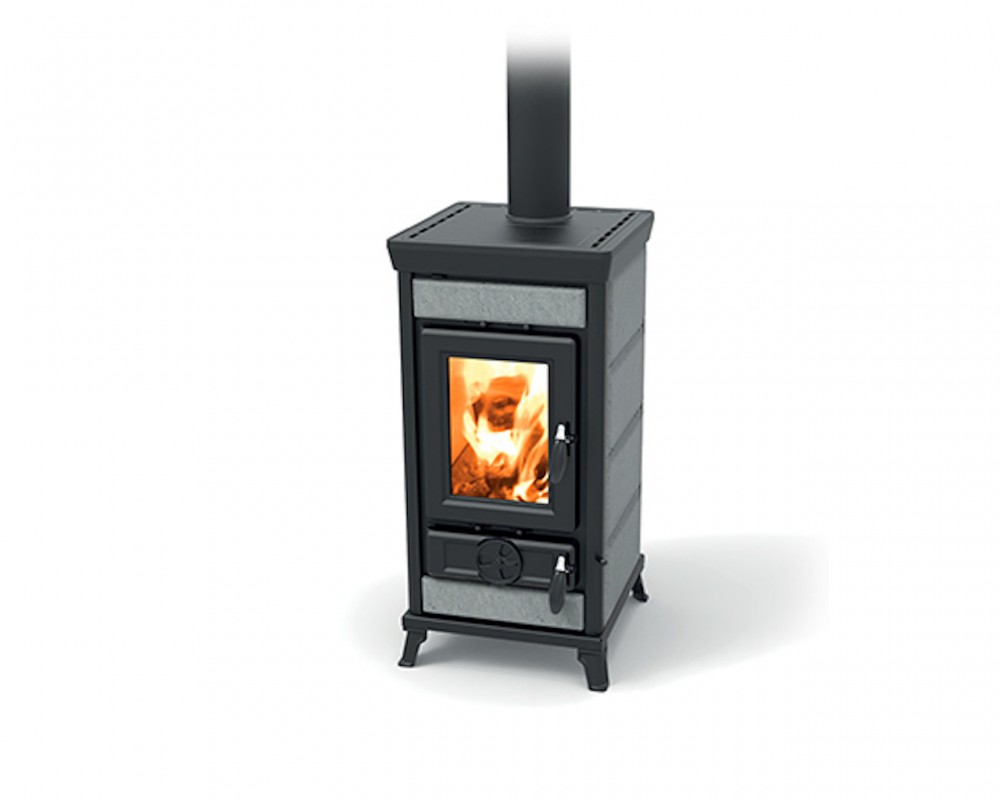 Peč na drva iz jekla in litega železa z veliko izmenjevalno površino in dolgo prisilno potjo dima, s posebnim izmenjevalcem toplote iz nerjavečega jekla, zgorevalno komoro iz litega železa, registri za regulacijo primarnega, sekundarnega in terciarnega zraka, protiopeklinski ročaji iz jekla, stresalno rešetko, vrata iz litega železa s keramičnim steklom odpornim na 750°, zgornja plošča iz emajliranega litega železa, odstranljiv predal za pepel.