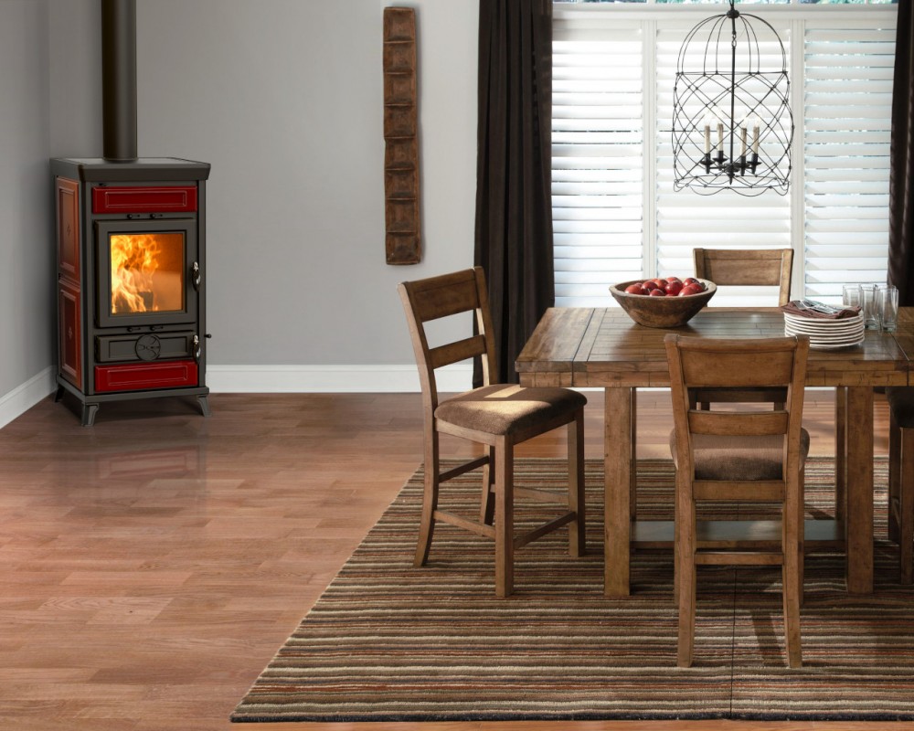 Peč na drva iz jekla in litega železa z veliko izmenjevalno površino in dolgo prisilno potjo dima, s posebnim izmenjevalcem toplote iz nerjavečega jekla, zgorevalno komoro iz litega železa, registri za regulacijo primarnega, sekundarnega in terciarnega zraka, protiopeklinski ročaji iz jekla, stresalno rešetko, vrata iz litega železa s  keramičnim steklom odpornim na 750°, zgornja plošča iz emajliranega litega železa, odstranljiv predal za pepel.