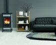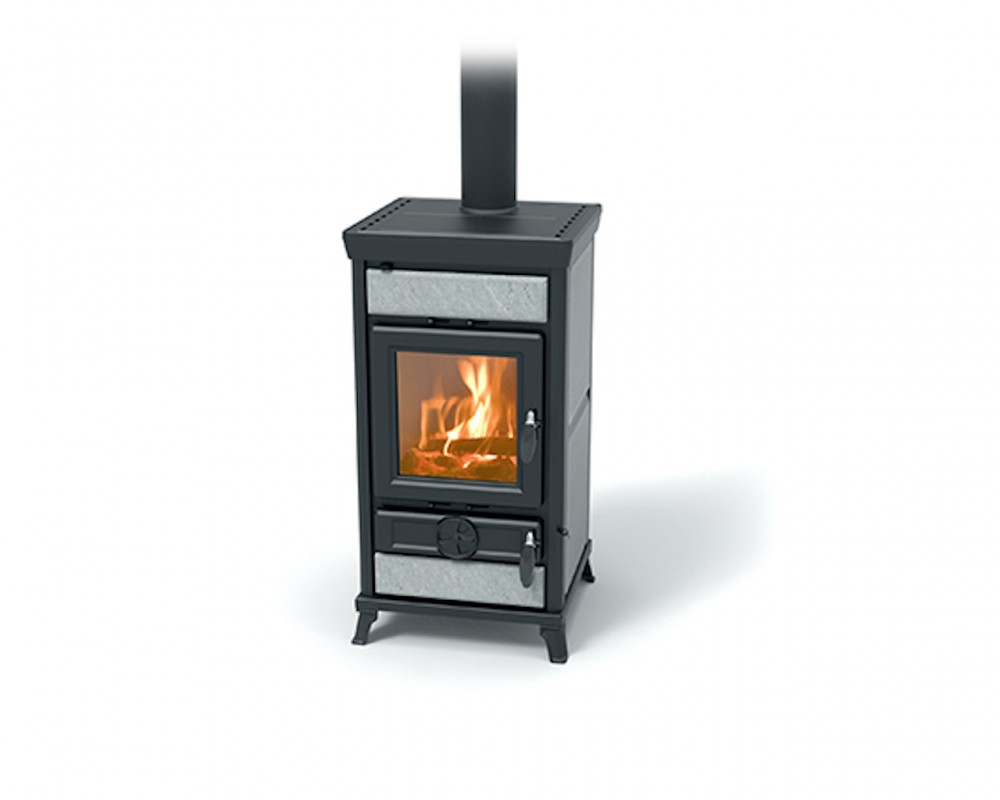 Peč na drva iz jekla in litega železa z veliko izmenjevalno površino in dolgo prisilno potjo dima, s posebnim izmenjevalcem toplote iz nerjavečega jekla, zgorevalno komoro iz litega železa, registri za regulacijo primarnega, sekundarnega in terciarnega zraka, protiopeklinski ročaji iz jekla, stresalno rešetko, vrata iz litega železa s keramičnim steklom odpornim na 750°, zgornja plošča iz emajliranega litega železa, odstranljiv predal za pepel.