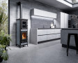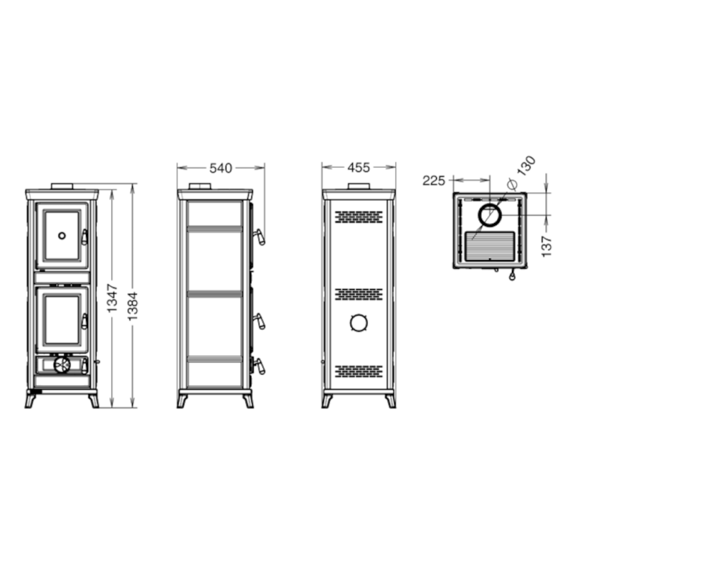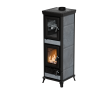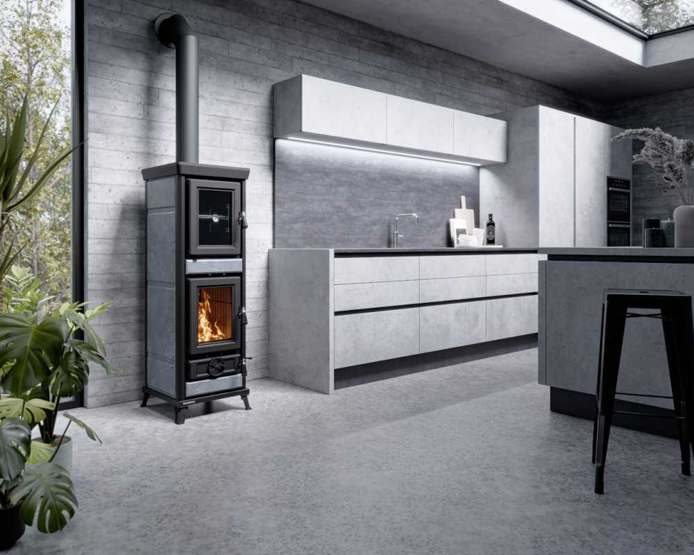 Peč na drva z vgrajeno pečico iz jekla in litega železa z veliko izmenjevalno površino in dolgo prisilno potjo dima, s posebnim izmenjevalcem toplote iz nerjavečega jekla, zgorevalno komoro iz litega železa, registri za regulacijo primarnega, sekundarnega in terciarnega zraka, protiopeklinski ročaji iz jekla, stresalno rešetko, vrata iz litega železa s keramičnim steklom odpornim na 750°, zgornja plošča iz emajliranega litega železa, odstranljiv predal za pepel.