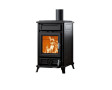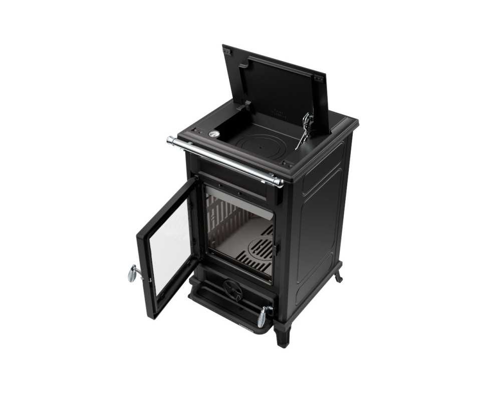 Peč na drva iz litoželezne strukture in kovinske obloge, klasične oblike. Vgrajena pečica.