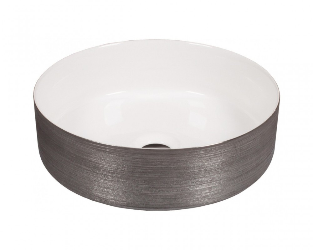 Dvobarvni nadpultni umivalnik dimenzij 36x36x12 cm v srebrno beli kombinaciji.